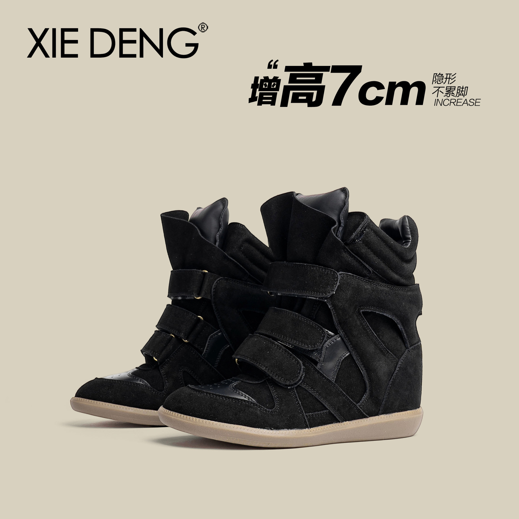 "Shoe Deng" European and American 7CM invisible height increase high-top shoes 2025 new versatile Velcro leather high-top women's shoes