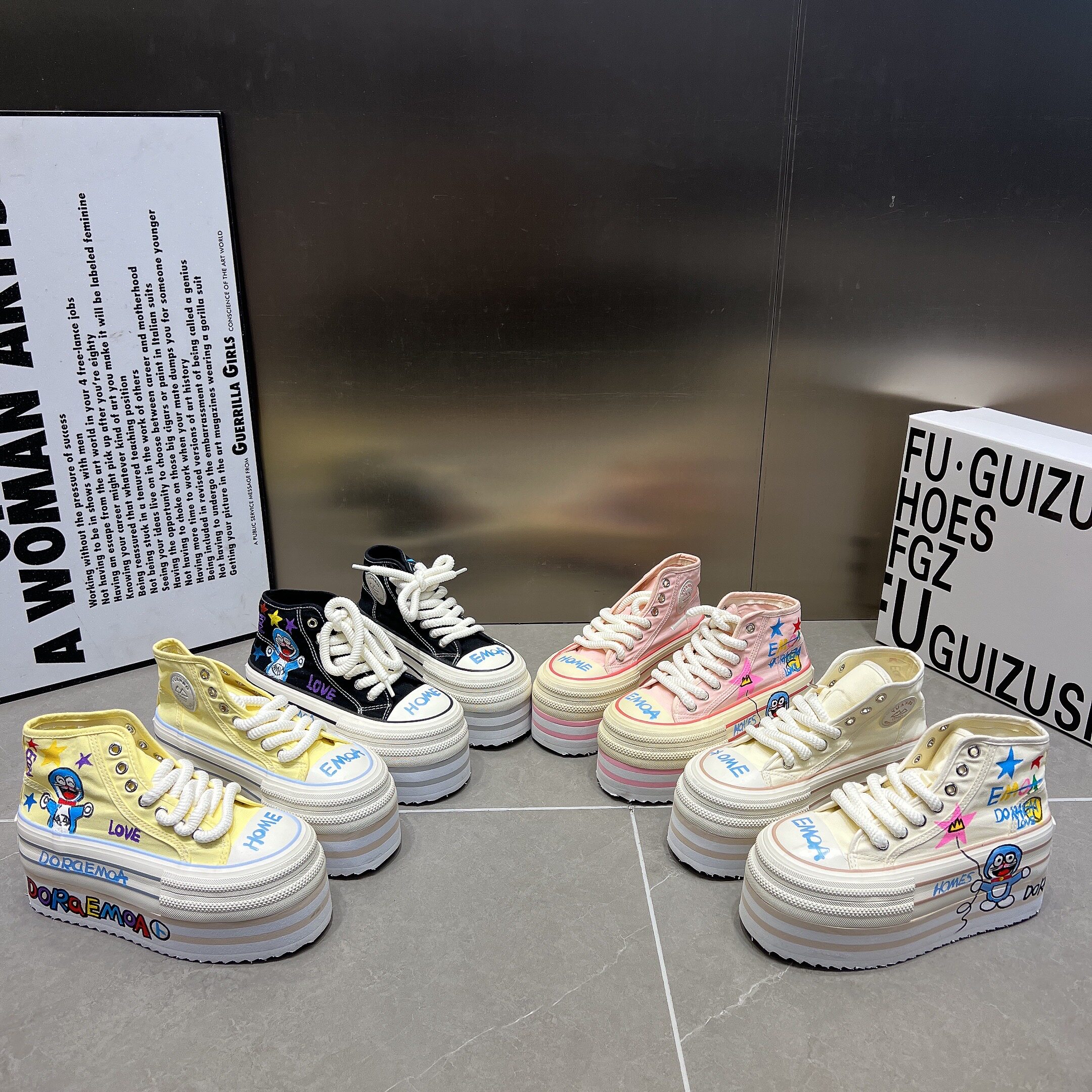 Candy color canvas cartoon letter casual shoes women's 2026 new 7cm small high-top single shoes lace-up board shoes