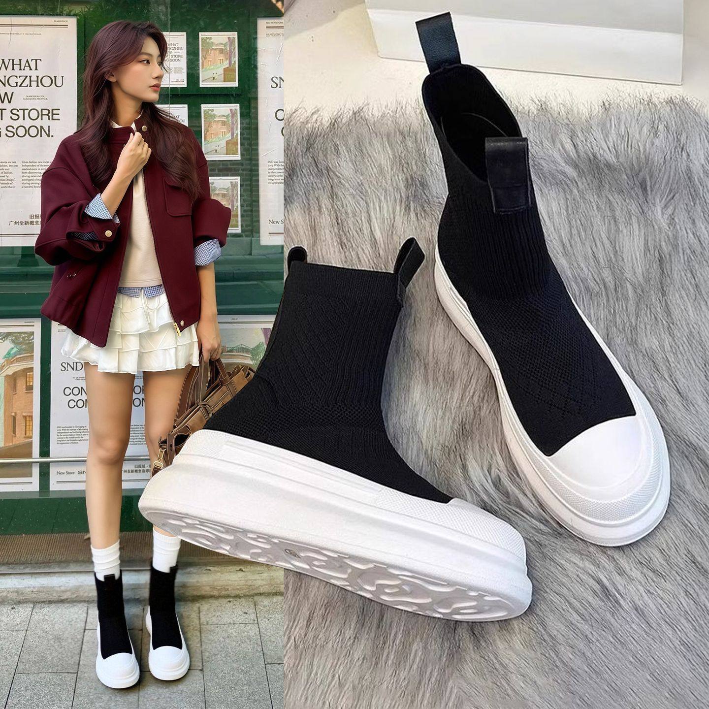 Hong Kong 2025 fly knitted breathable single boots, muffins, platform socks, boots, short boots, women's skinny boots, knitted casual high-tops