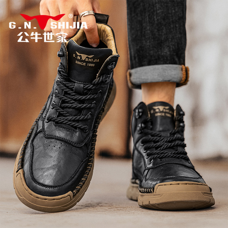 Bull Family Men's Shoes Winter Genuine Leather Athleisure High-Top Leather Shoes Men's 2025 New Fleece Cargo Martin Boots