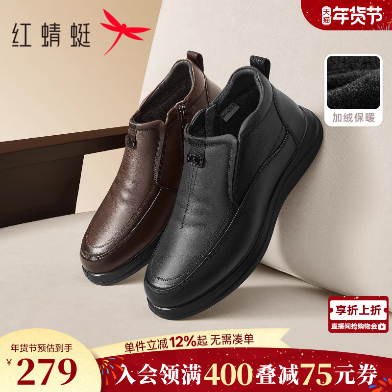 Red dragonfly dad shoes winter men's leather shoes leather soft soles thickened warm cotton boots for middle-aged and elderly high-top cotton shoes