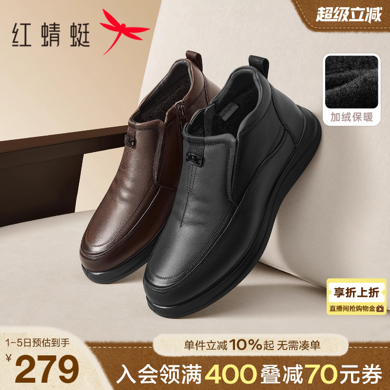 Red dragonfly dad shoes winter men's leather shoes leather soft soles thickened warm cotton boots for middle-aged and elderly high-top cotton shoes