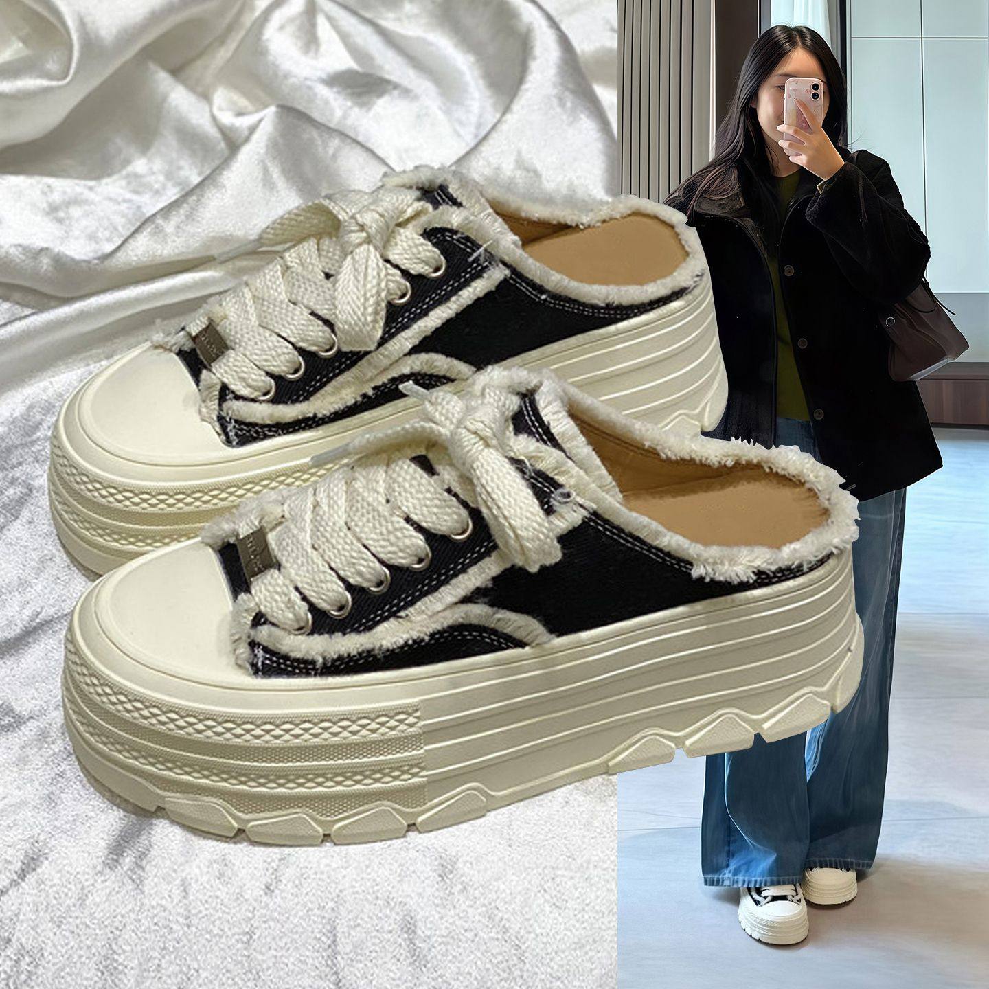 Hong Kong big-headed thick-soled canvas half slippers women's 2026 summer new casual and versatile lazy person one-foot slippers