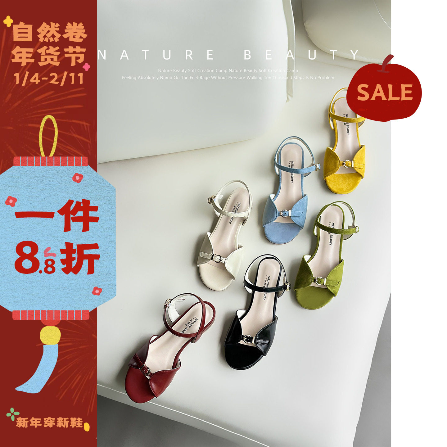 Natural curl thick heel casual simple open-toe commuter sandals French temperament one-line with open-toe Roman beach shoes for women