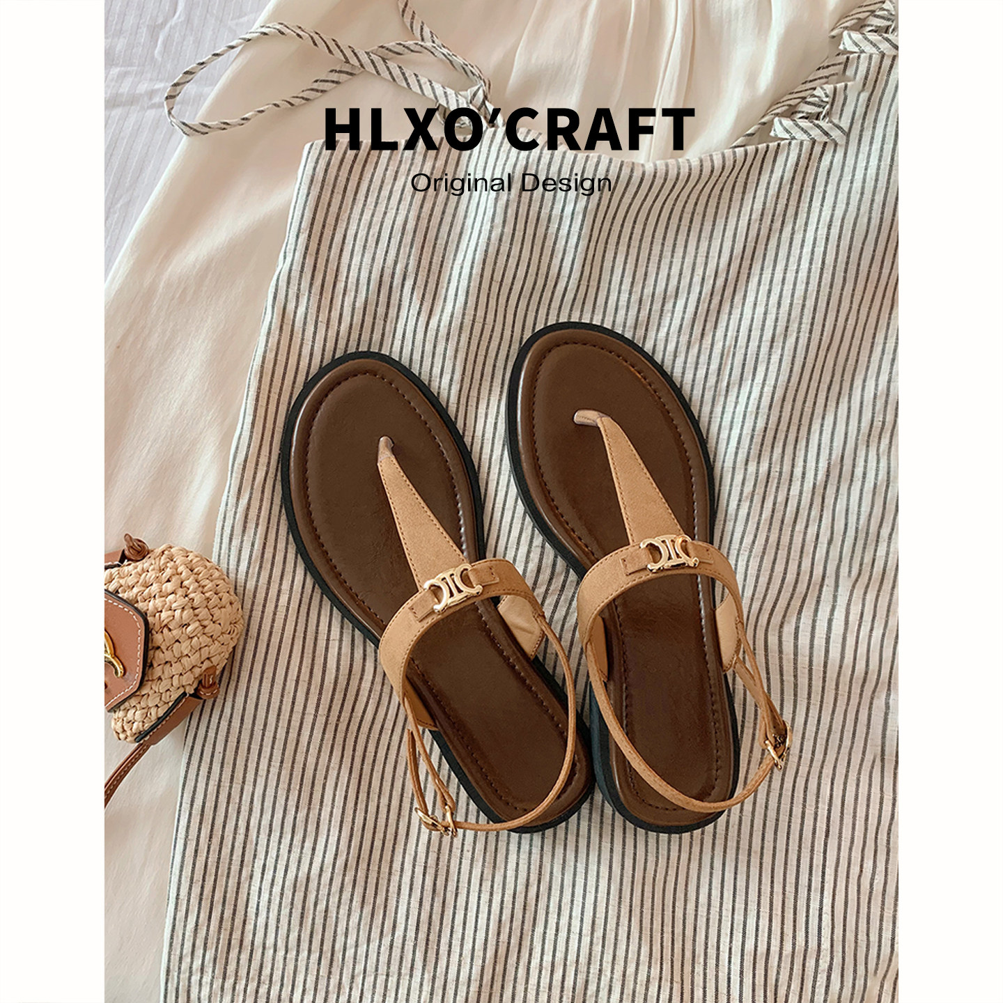 Genuine leather ~ retro T-shaped strap herringbone sandals women's summer 2025 new resort style versatile metal buckle clip-on sandals