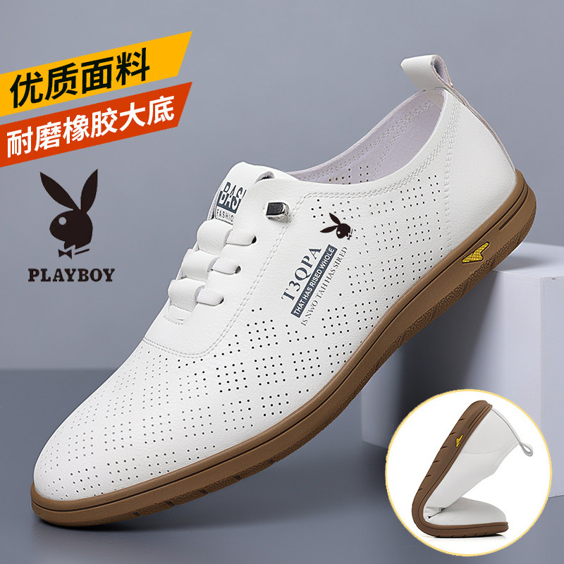 Playboy 100% All Cowhide Men's Shoes 2025 Men's Genuine Leather Sports Hollow Sandals Breathable Little White Shoes Men