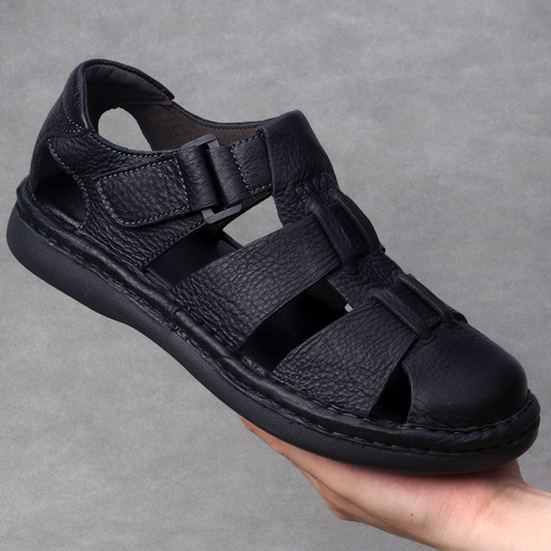 Summer Men's Genuine Leather Cowhide Sandals Casual Outdoor Lightweight Black Beach Shoes Toe Papa Shoes Breathable