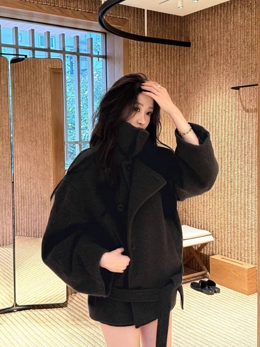 Black Stand-Up Collar Thickened Woolen Coat for Women, Short Style for Petite Figures, 2025 Winter New Korean Style Loose Woolen Overcoat