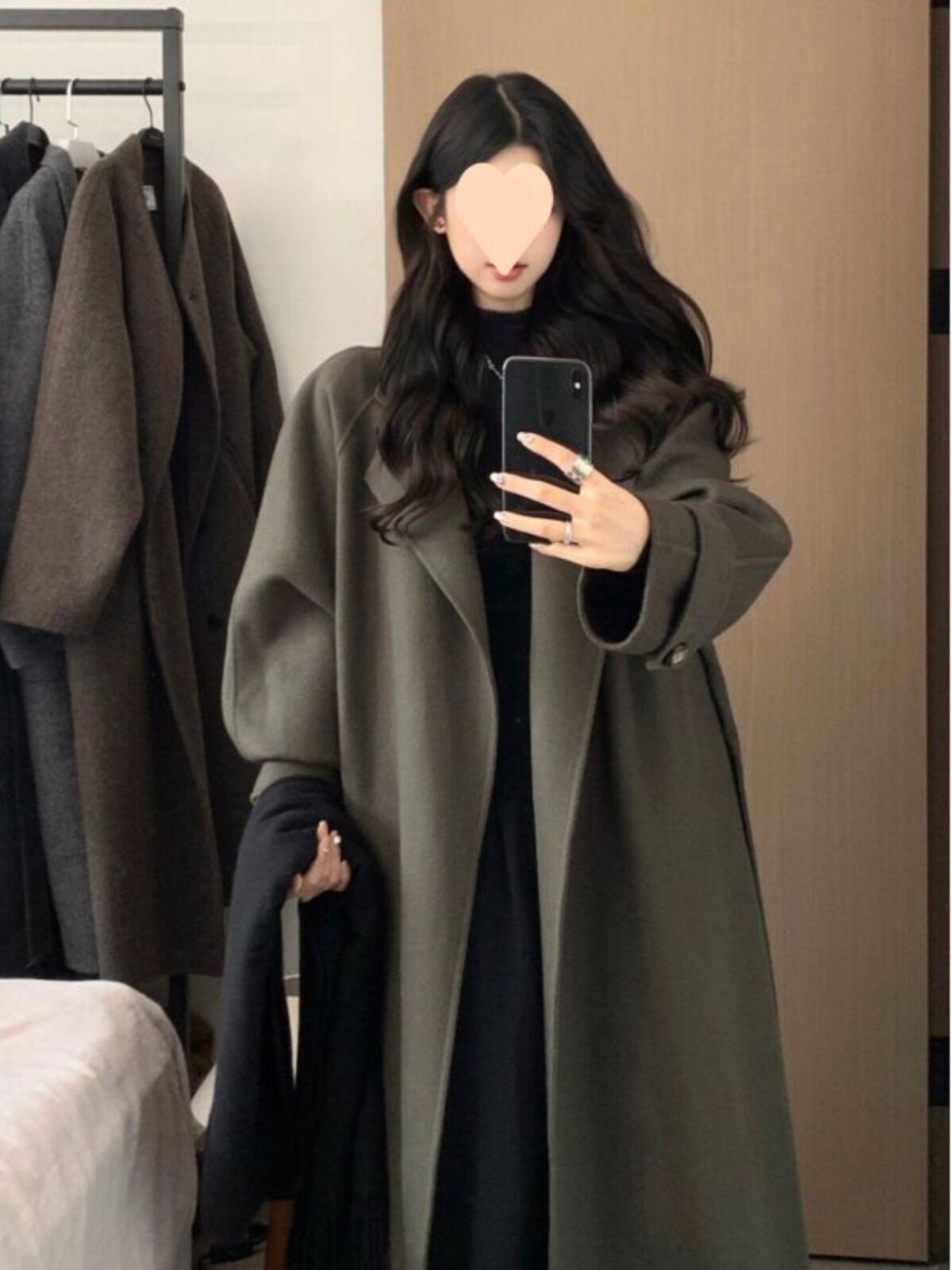 Mist Gray Green Woolen Coat for Women, Autumn and Winter Korean Style Plus Size 100kg High-End Petite Hepburn Style Woolen Coat