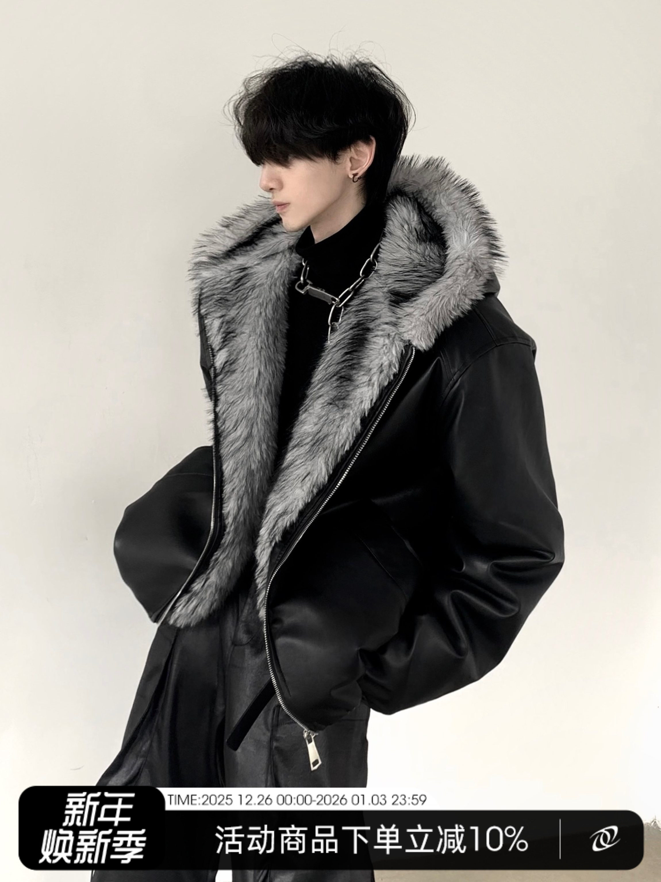 Autumn Mountain Wind/Wolf King Mountain Eagle Hooded Thick Coat with Large Fur Collar for Men, Winter Fleece-Lined High-End Visual Style Leather Jacket