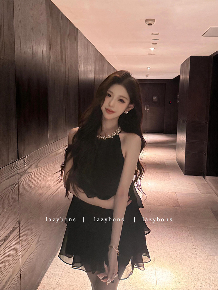 Pearl Halter Neck Dress Set for Women, Summer Light Luxury Socialite Birthday Dress, Elegant Two-Piece Little Black Dress
