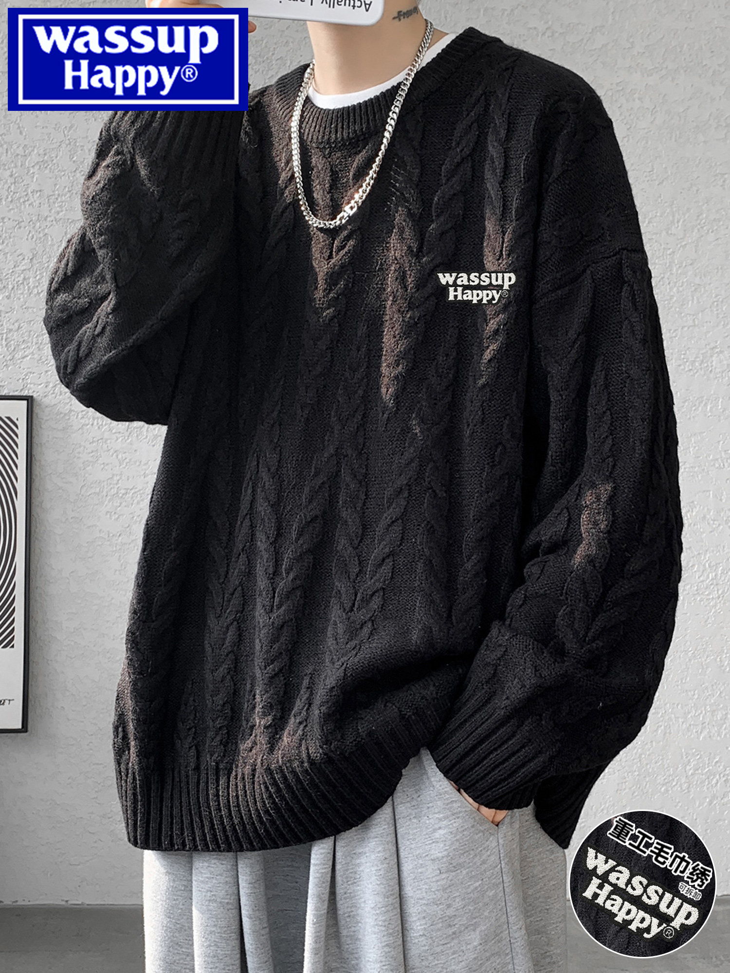 Wassup Happy Sweater for Men, New Thickened and Warm Autumn/Winter Style, Trendy Brand, Oversized, Lazy Style, Knitted Base Shirt