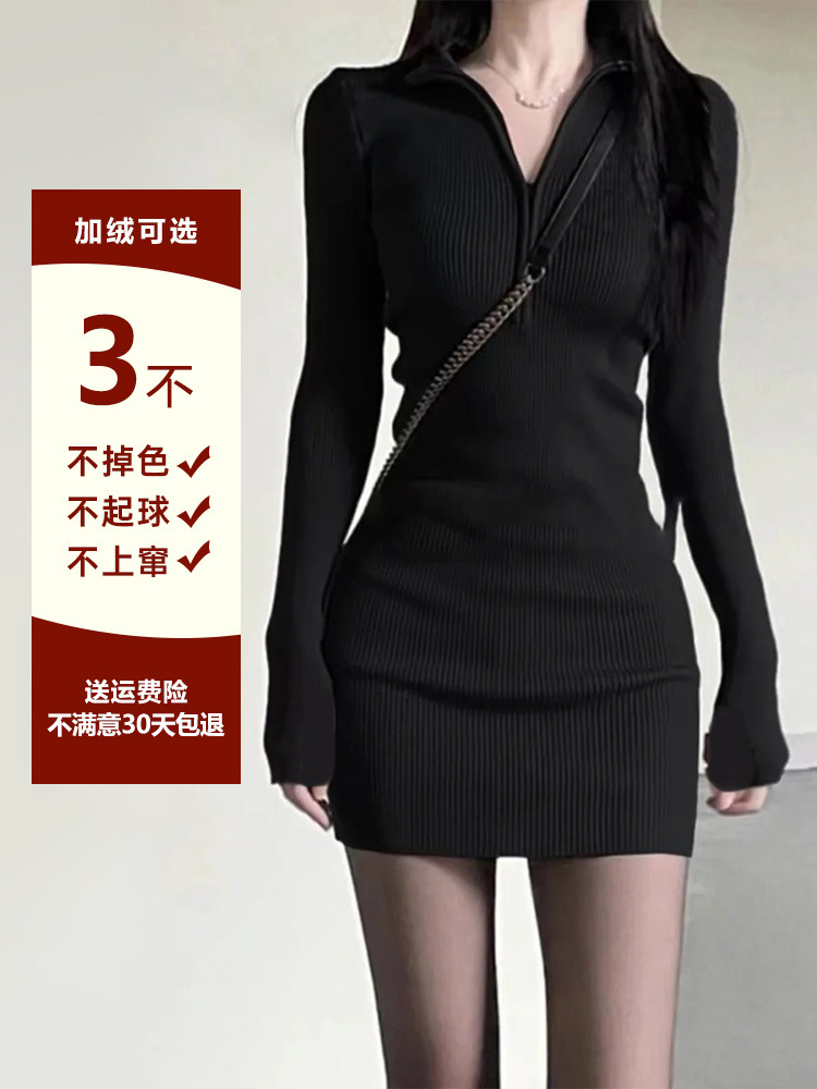 Black Bodycon Skirt with Long Sleeves, Inner Dress, Cinched Waist, Slim Fit, Slimming, Little Black Dress, Autumn and Winter Waist-Cinching Dress