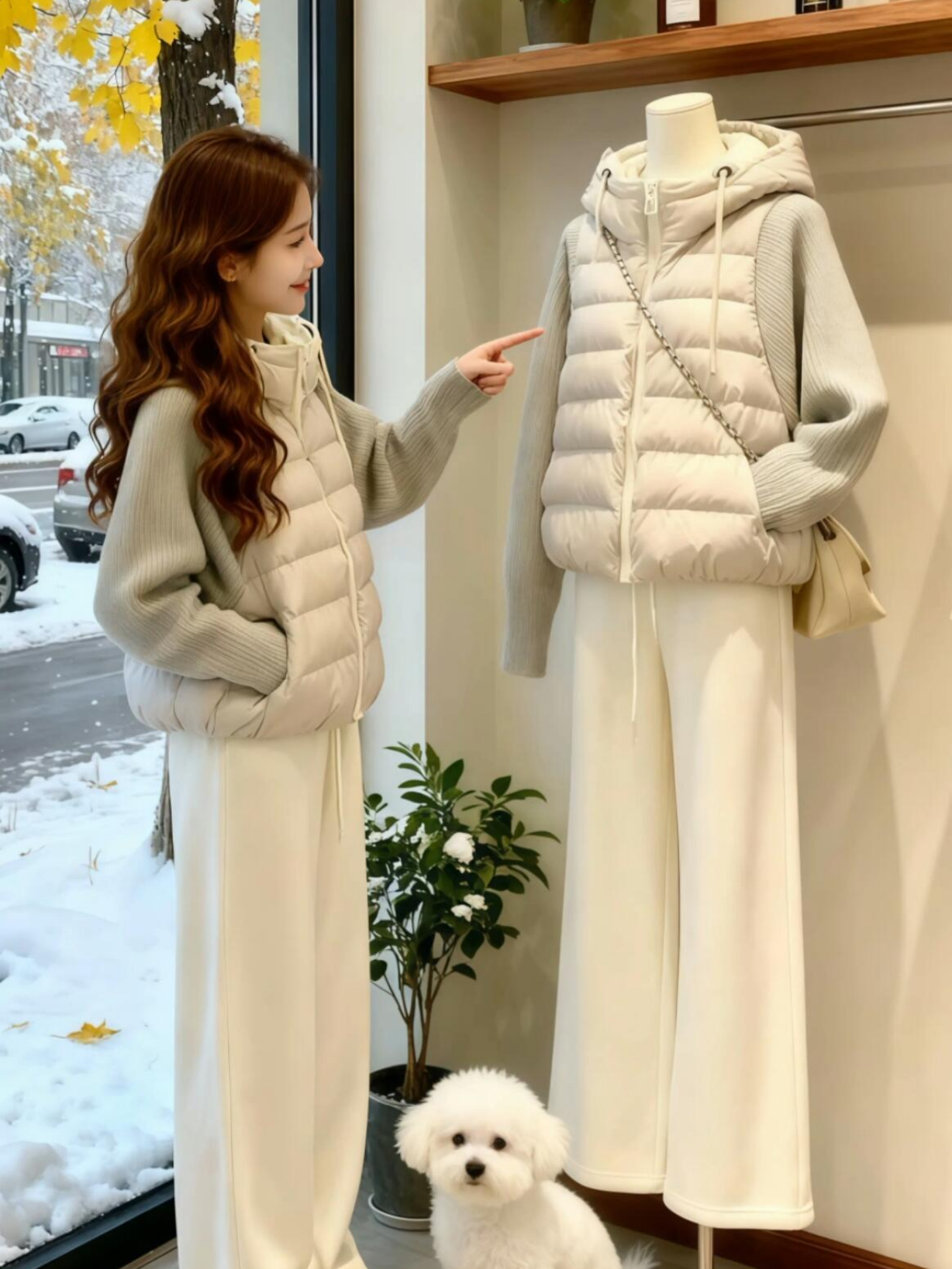 Lightweight Knitted Patchwork Cotton Jacket for Women, 2025 Winter New Korean Style Faux Two-Piece Cotton Coat, Warm Cotton-Padded Jacket