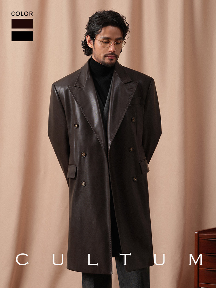 Cultum Peaked Lapel Double-Breasted Chester Leather Coat Men's Mid-Length Casual Retro Solid Color Jacket Autumn and Winter