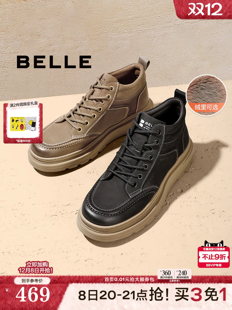 Belle Men's Shoes, Fleece-Lined Casual Shoes, Genuine Leather, Thick-Soled Height-Increasing Martin Boots, High-Top Sneakers, Short Boots A1332Dd3