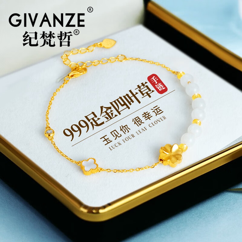 999 Pure Gold Four-Leaf Clover Gold Bracelet, Birthday Gift for Girls, Chinese Valentine's Day Gift for Girlfriend or Wife