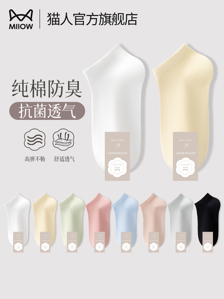 Cat-Themed Women's Short Socks, Pure Cotton, Antibacterial, Thin Summer Style, Solid Color Cotton Socks, Seamless, Odor-Resistant, Non-Slip, Sports No-Show Socks