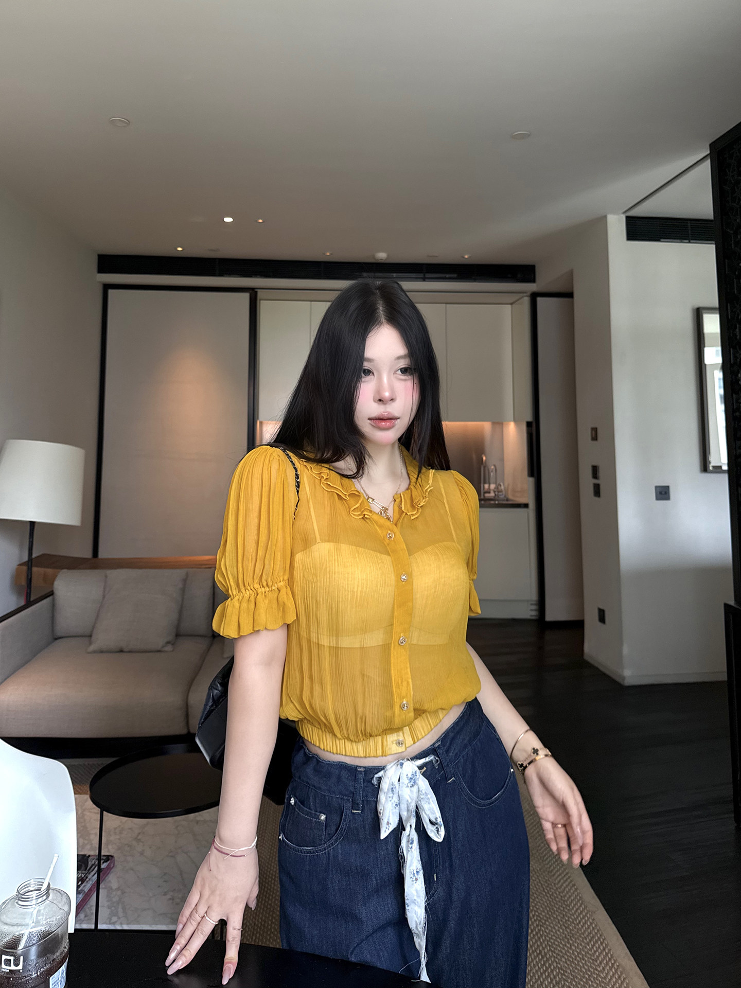 Kurosawa Xuanqi's 2025 Summer New Style Plus-Size Slimming Slightly Sheer Sexy Ruffle Top