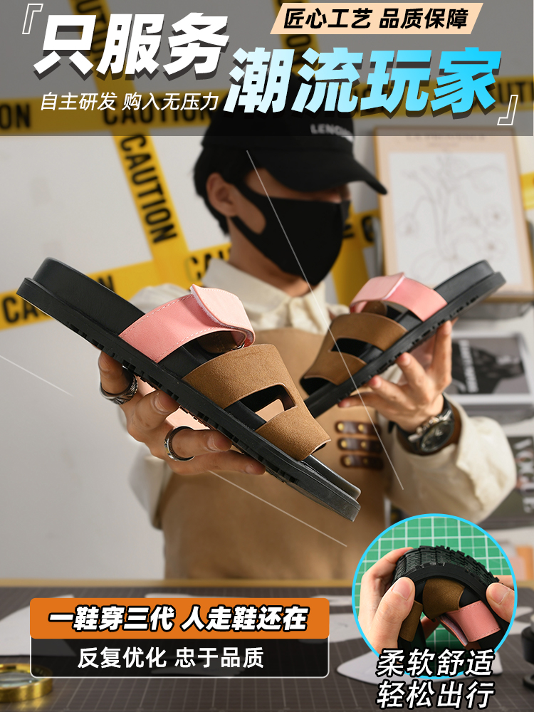 Authentic Erjiu H Slippers, New Summer Model, Thick-Soled Genuine Leather Beach Shoes, Pig Nose Magic Tape Sandals, Men's and Women's Shoes