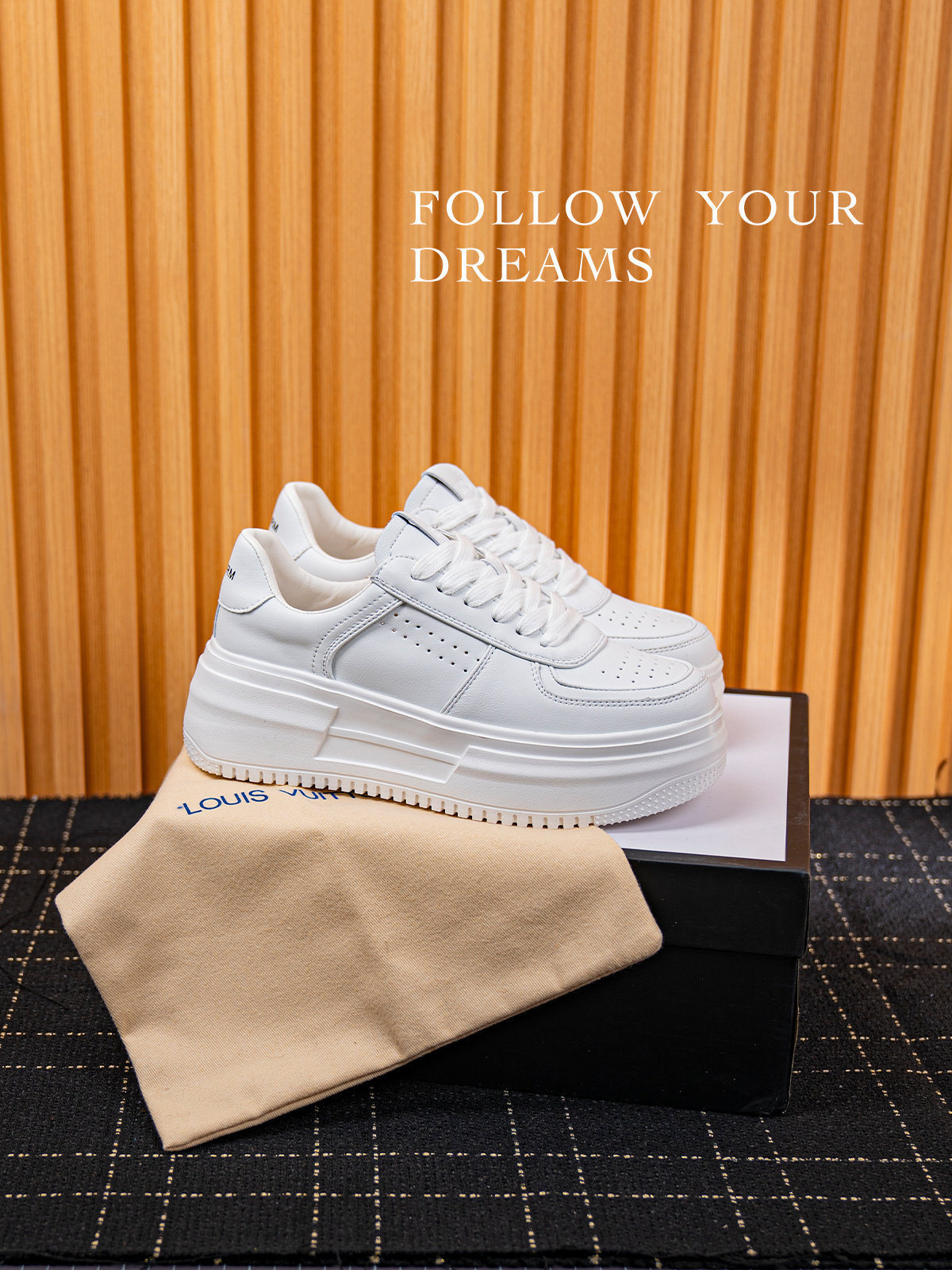 Shu Deng Genuine Leather Thick-Soled White Sneakers for Women, 2026 Spring New Style, Height-Increasing Lace-Up Round-Toe White Versatile Sneakers