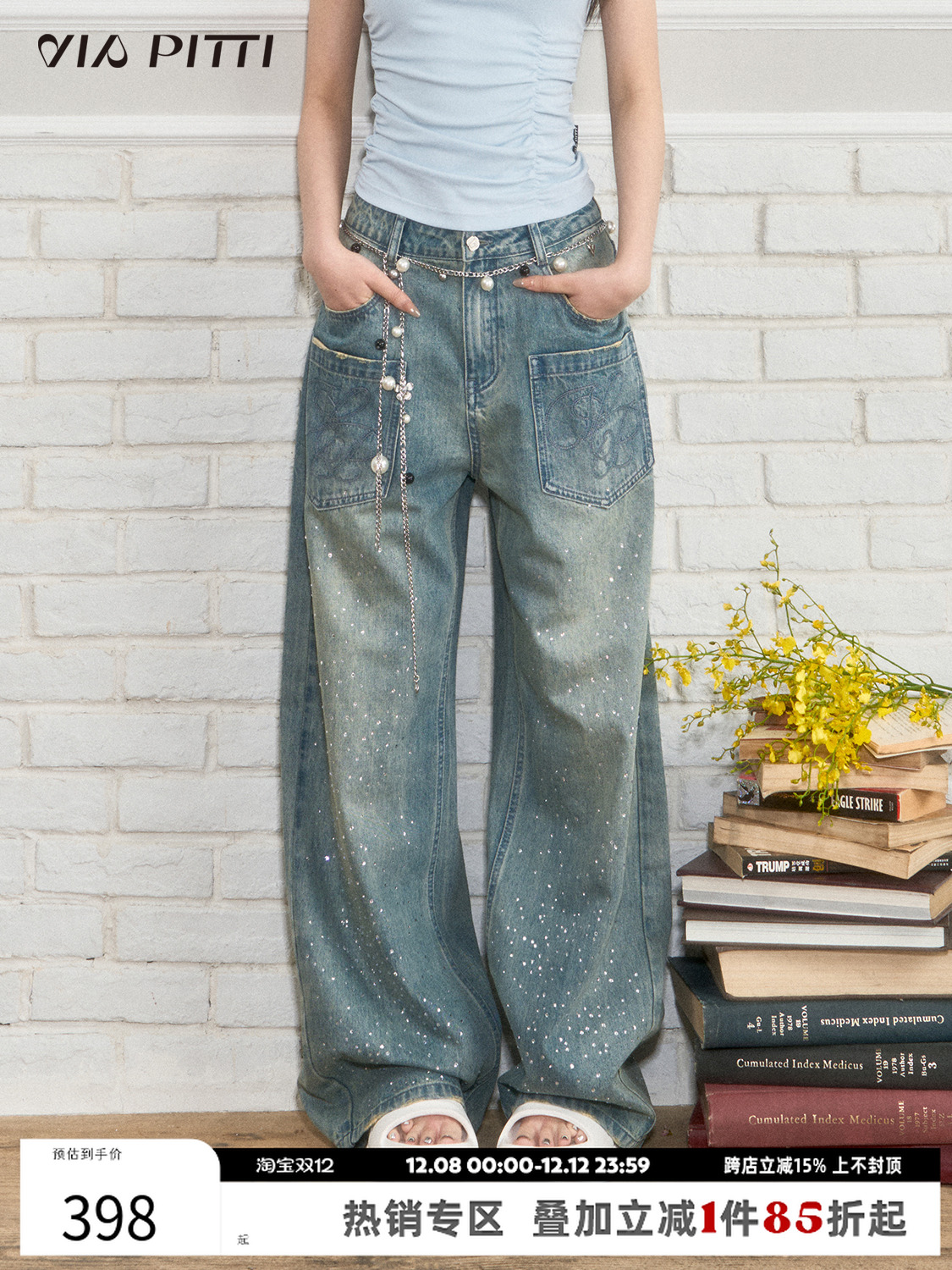 Viapitti Heavy-Duty Design with Three-Dimensional Rhinestones Wide-Leg Denim Pants Women's Summer Straight-Leg Vintage Jeans