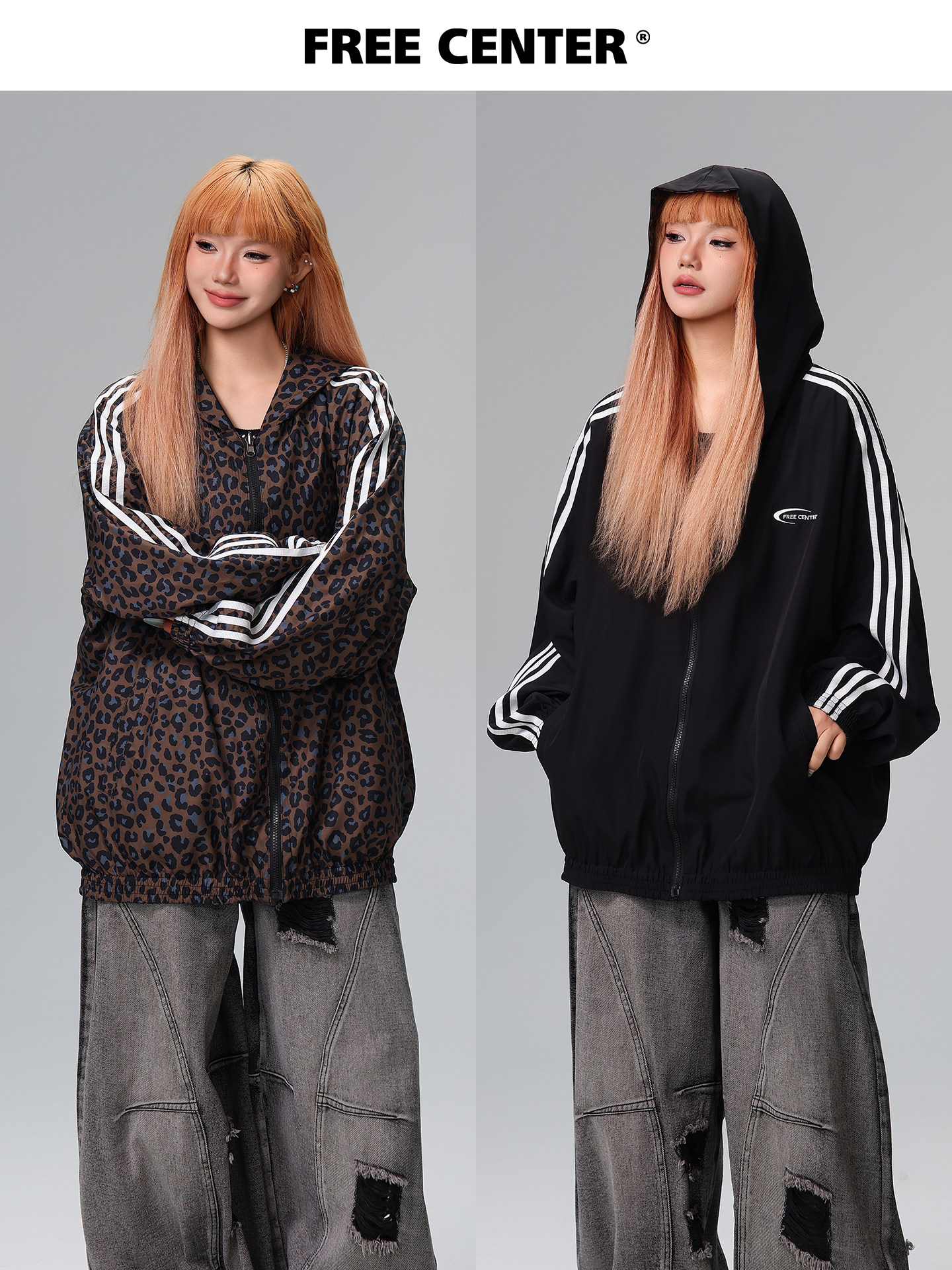 Free Center Reversible American Retro Leopard Print Jacket for Men and Women, Loose Hooded Casual Coat, Autumn Top