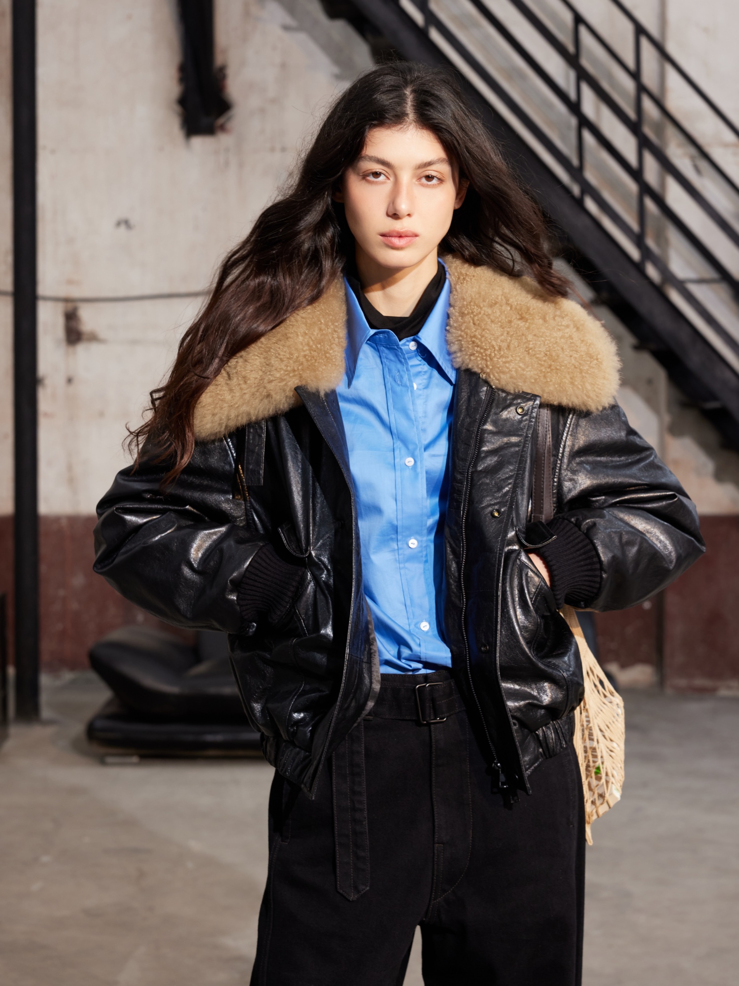 Madeinam British Imported Pearlescent Sheepskin_Classic Retro Cashmere Fur Large Fur Collar Bomber Jacket