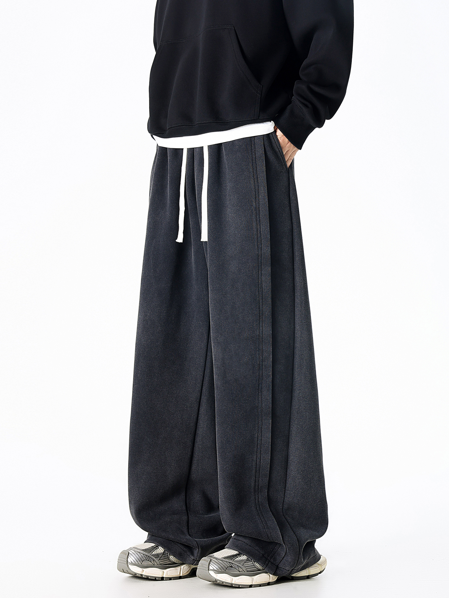 Dapige Black Straight-Leg Washed Sweatpants for Men, Autumn and Winter Fleece-Lined Loose Large Size Casual Pants, Sports Long Pants