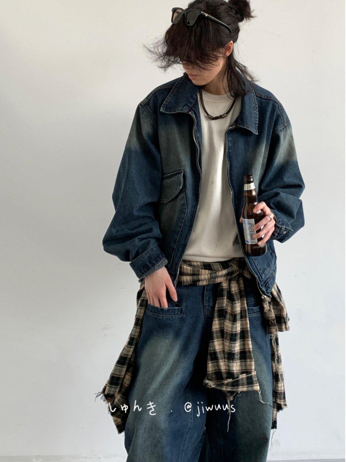 Jiwuus Spring Vintage Washed Distressed Short Denim Jacket Unisex Turn-Down Collar Loose Boyfriend Style Top