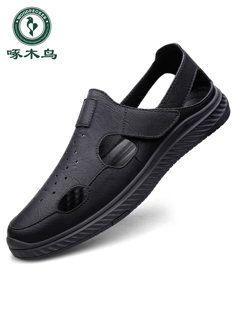 Woodpecker Men's Shoes Summer Hollow Non-Slip Closed-Toe Outdoor Sandals Men's Genuine Leather Casual Slip-On Perforated Leather Shoes