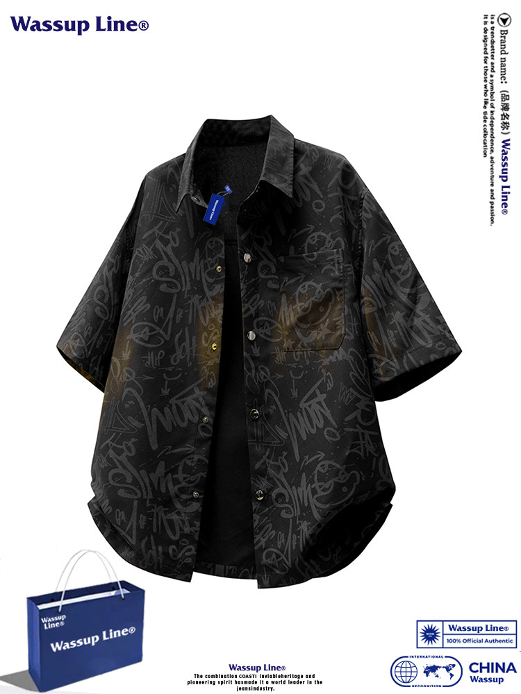 Wassup Line Trendy Brand Summer All-Over Print Short-Sleeve Shirt for Men, Loose Fit, Versatile, Breathable, Casual, Plus Size Top