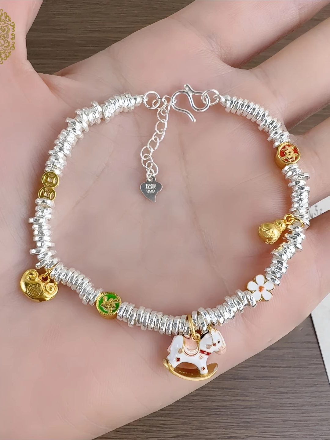Gold-Plated Wooden Horse Coiled Around Pure Silver Bracelet, 999 Pure Silver Broken Silver Beads Bracelet, Chinese Style Design, ins Style Hand Accessory Gift for Women