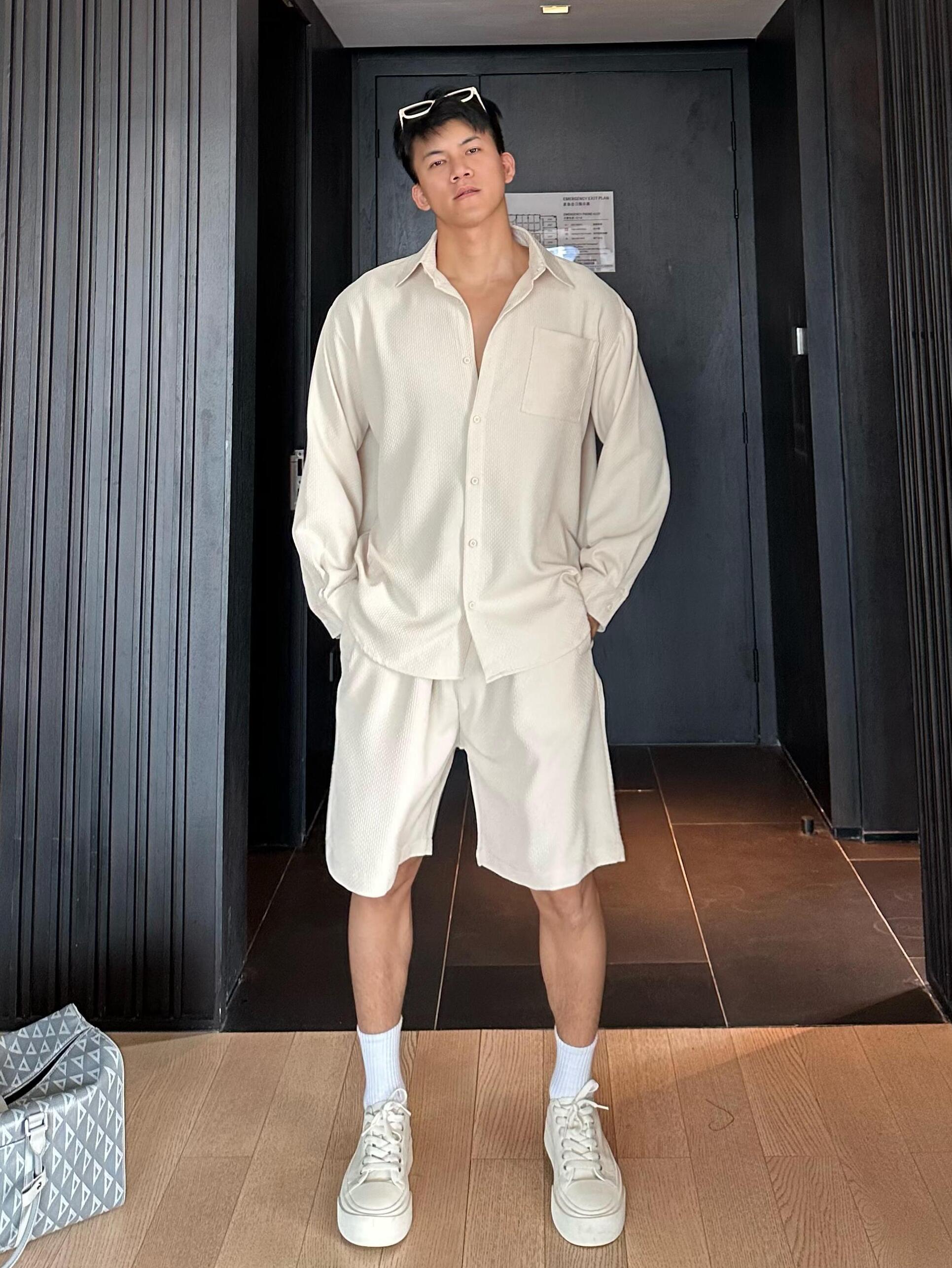 Jzd Apricot/Black Autumn Casual Relaxed Waffle Knit Loose Casual Long-Sleeve Shirt and Shorts Fashion Set