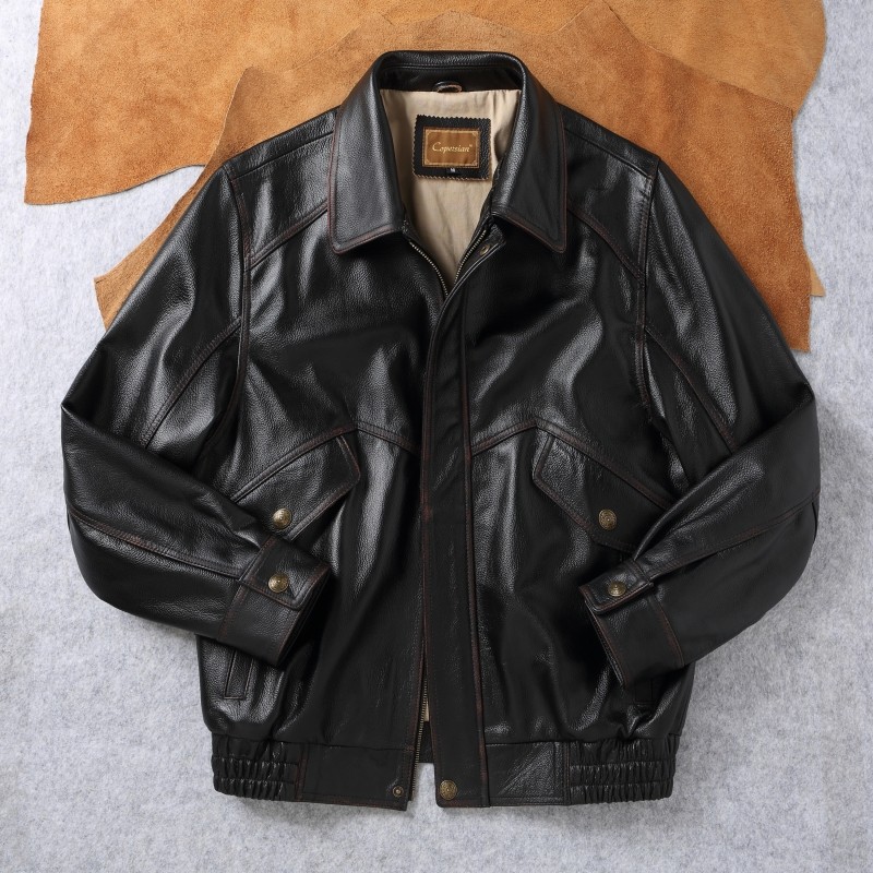 Classic Hong Kong Style Wide-Fit Flight Suit First-Layer Cowhide Genuine Leather Jacket Men's Vintage Hand-Rubbed Color Large Size Leather Jacket