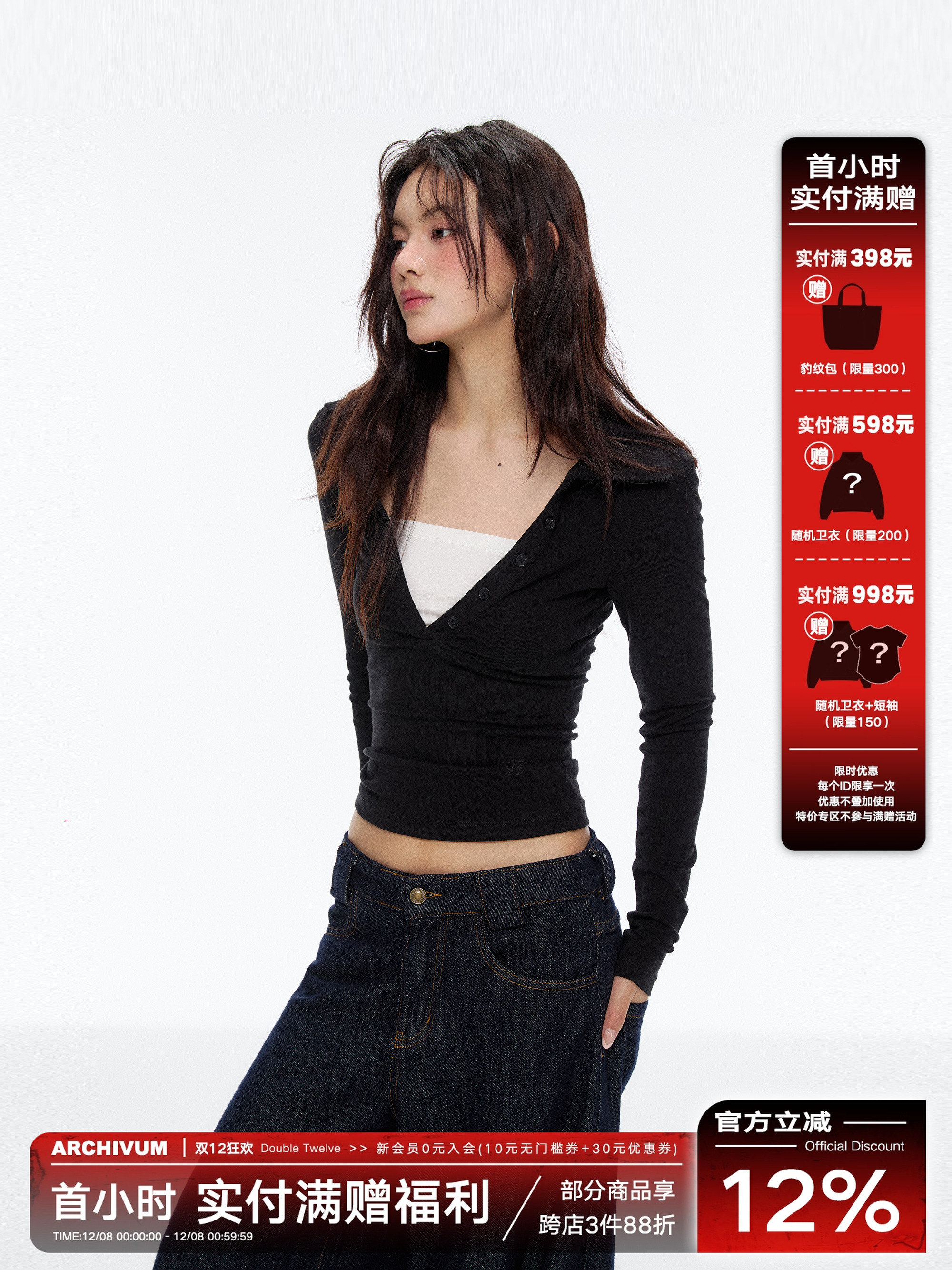 Archivum Fake Two-Piece Color-Block Polo Deep V-Neck Knitted Long-Sleeve Versatile Slim-Fit Commuter Top for a Trendy Look