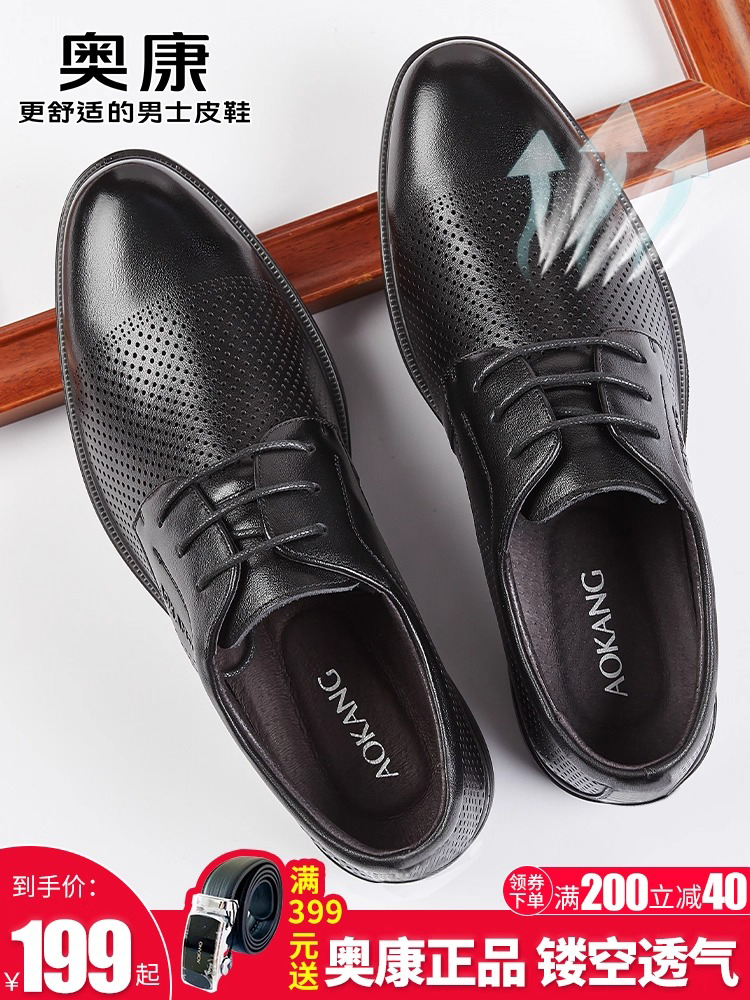 Aokang Men's Sandals 2025 Summer Hollow Breathable Genuine Leather Business Formal Men's Soft-Soled Leather Shoes Large Size Clogs