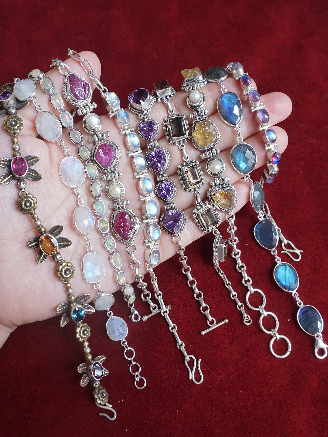 Handmade Sterling Silver Bracelet with Natural Moonstone, Opal, Amethyst, Imported from Nepal and India, 925 Silver Jewelry, Vintage Style