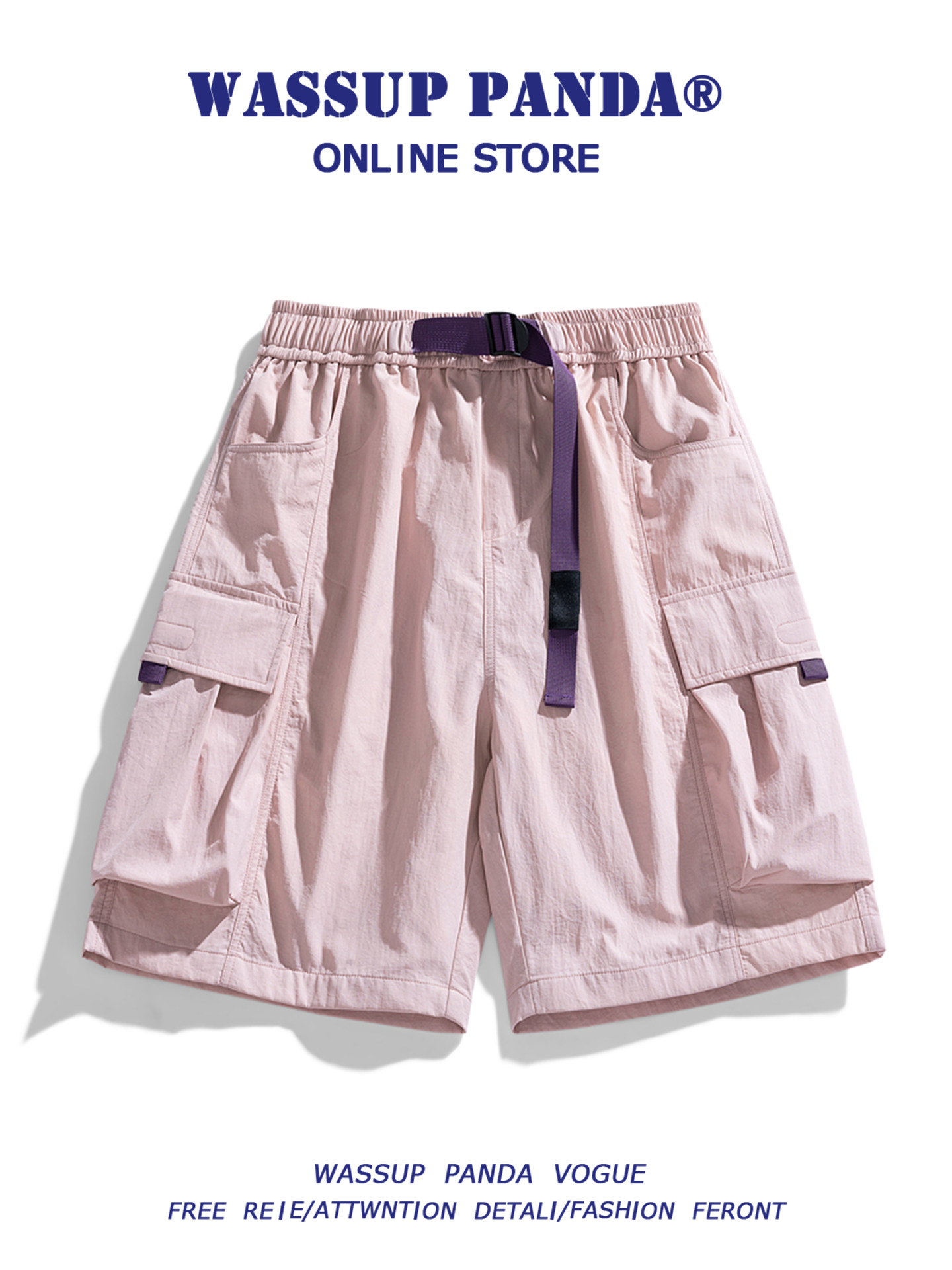 Wassup Panda Japanese-Style Pink Cargo Shorts for Men, Summer Trendy Functional Style Couple Casual Five-Point Shorts