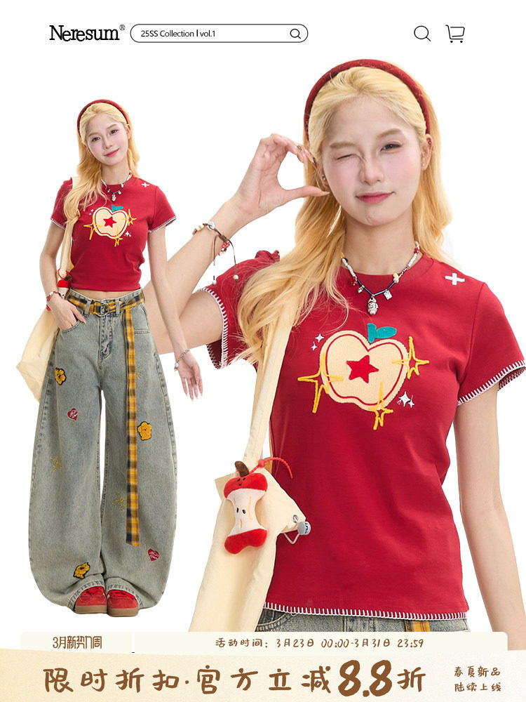 Neresum Apple Embroidered Short-Sleeve T-Shirt for Women, American Retro Sweet and Spicy Slim Fit, Regular Shoulder, Versatile Red Top