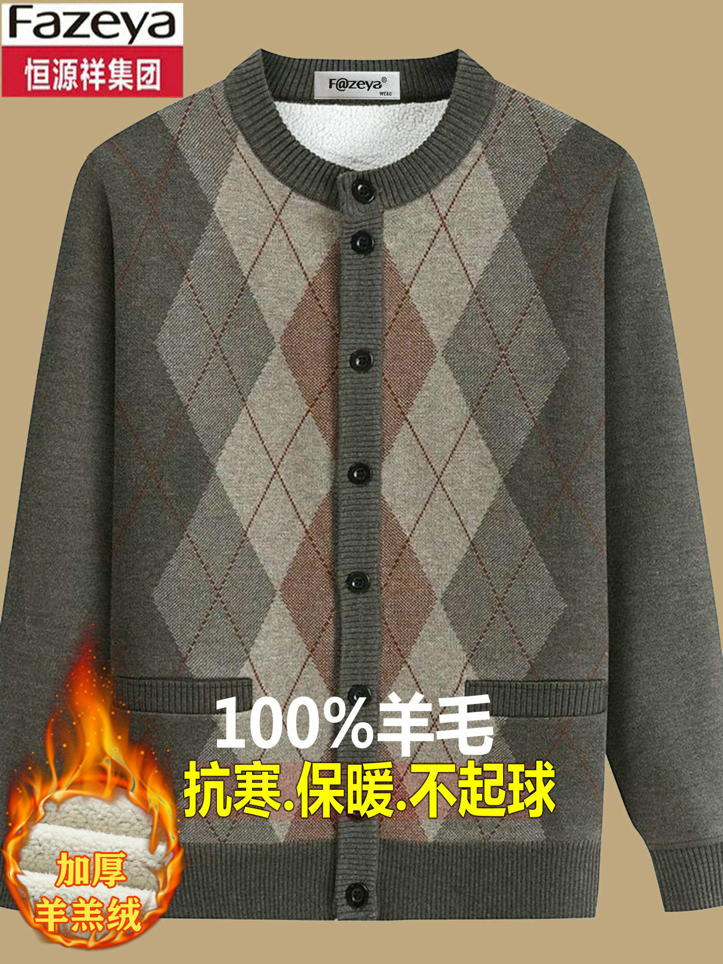 Hengyuanxiang Colorful Wool Sweater Men's Cardigan Sweater for Middle-Aged and Elderly Men, Dad's Clothing, Fleece-Lined and Thickened Sweater Knit Jacket