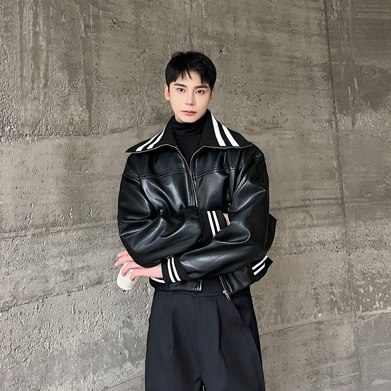 Autumn and Winter Korean Style Large Lapel Silhouette Pu Leather Jacket for Men, Vintage High-End Short Leather Jacket, Biker Top, Trendy