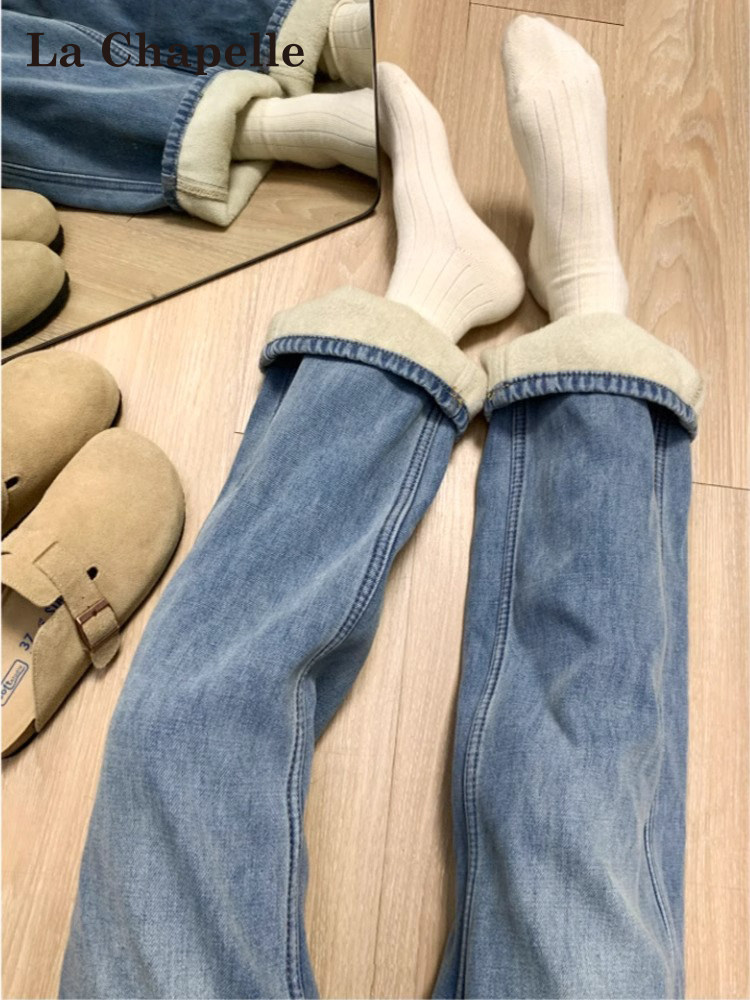 La Chapelle Fleece-Lined Straight-Leg Jeans for Women, Autumn and Winter, Pear-Shaped Body, Petite, High-Waisted, Narrow Wide-Leg Pants