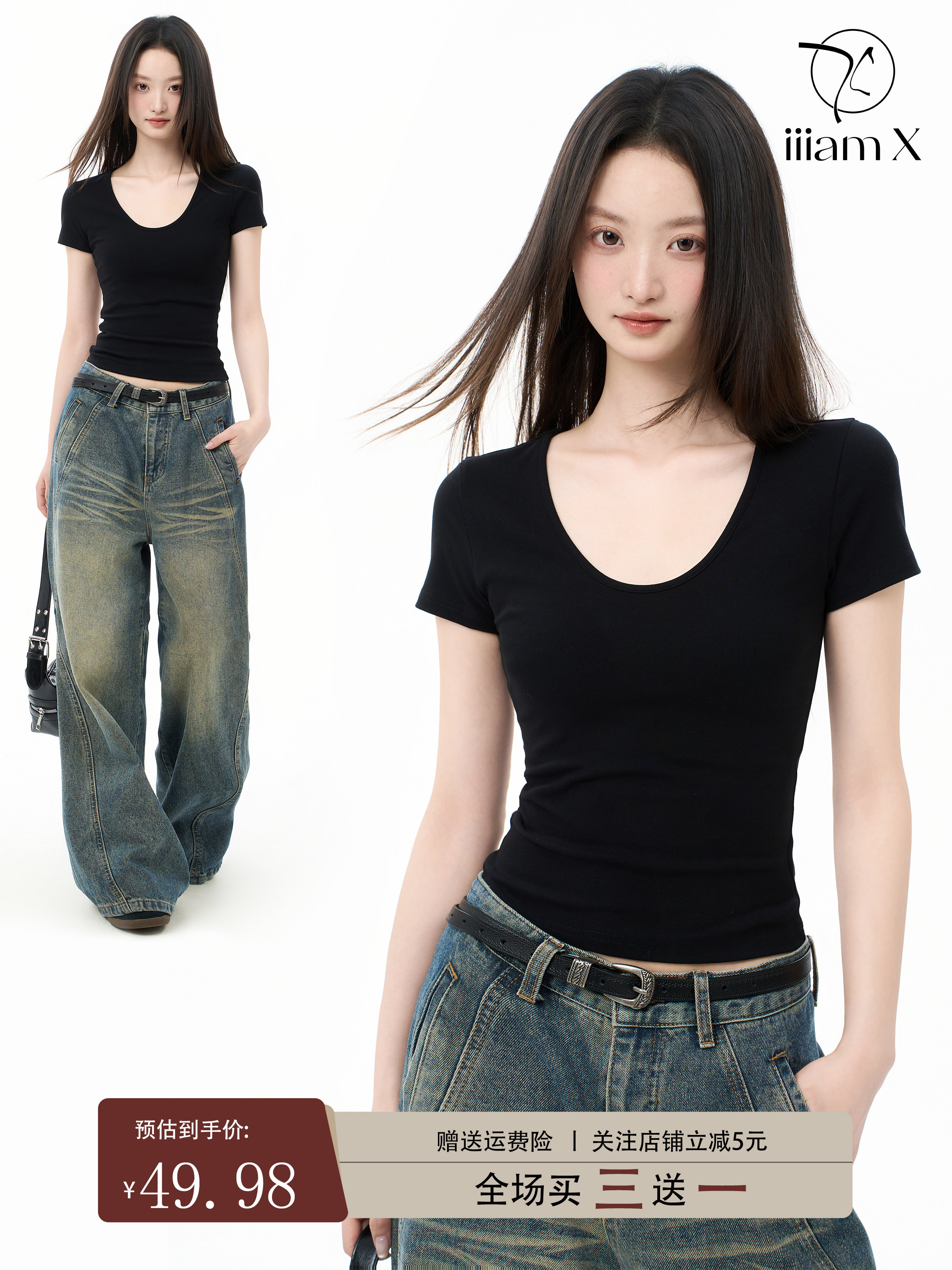 Iiiamx Black U-Neck Large Neckline Short-Sleeve T-Shirt for Women, Summer Slim Fit, Regular Shoulder, Slimming Base Top, 2026 New Model