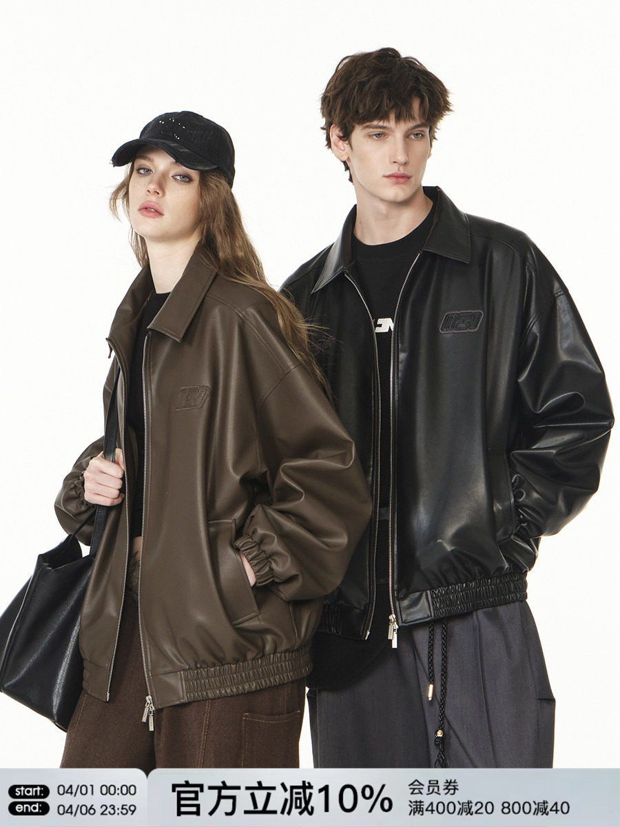 Fornines Embroidered Lapel Brown Leather Jacket for Men and Women, Trendy Brand Spring and Autumn Pu Leather Jacket, American Retro Style Coat