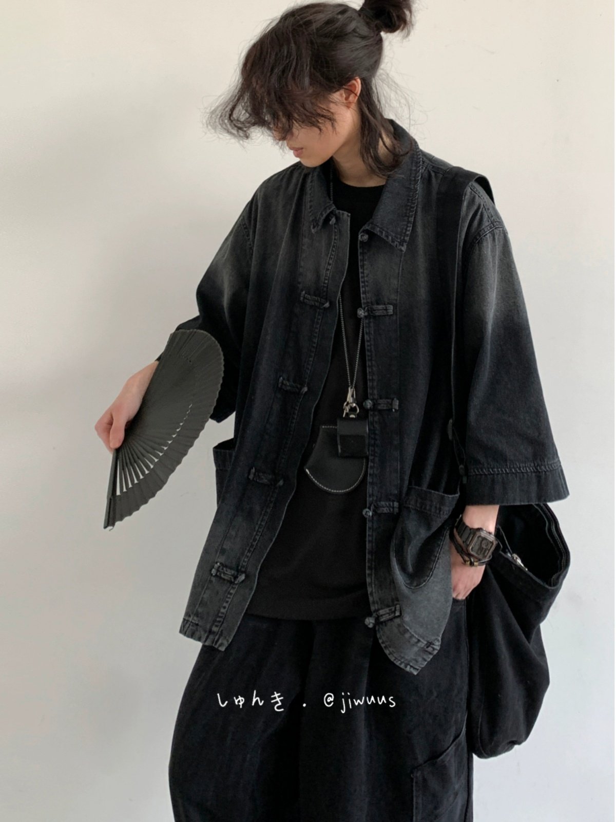 Jiwuus Summer New Chinese Style Vintage Denim Jacket for Men and Women, Loose Retro Button-Up Washed Denim Top