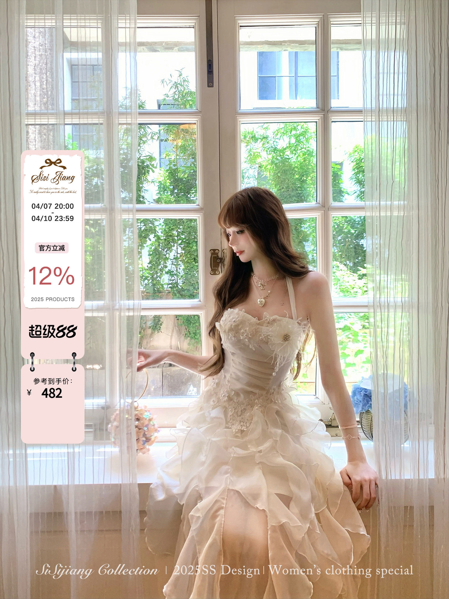 Sisi Jiang's "Garden Waltz" French Elegant Lace Waist-Cinching Mesh Floral Long Skirt