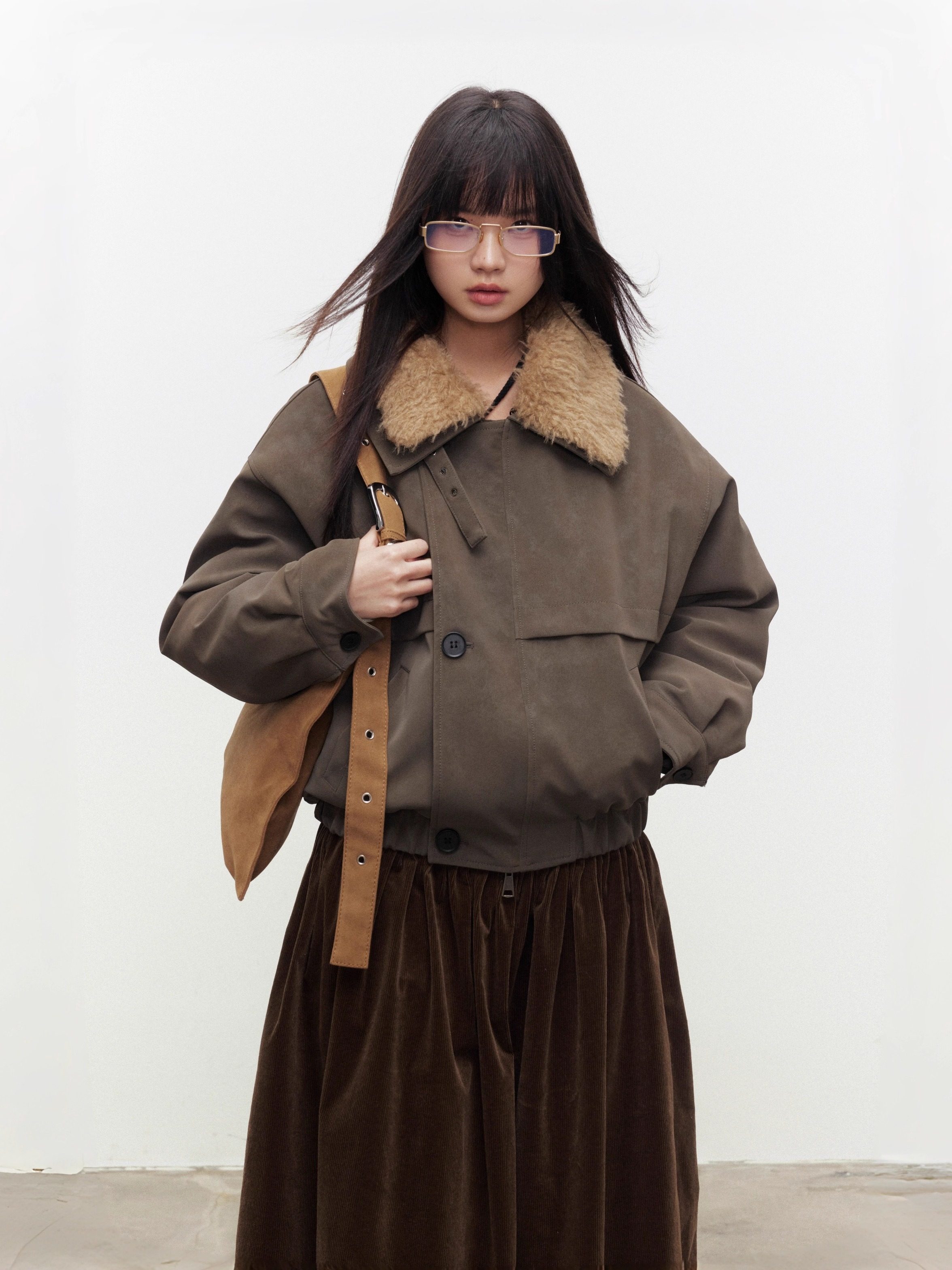 Aunp Retro Tea Brown Short Workwear Cotton Jacket for Women Winter Barn Style Detachable Fur Collar Suede Jacket Coat