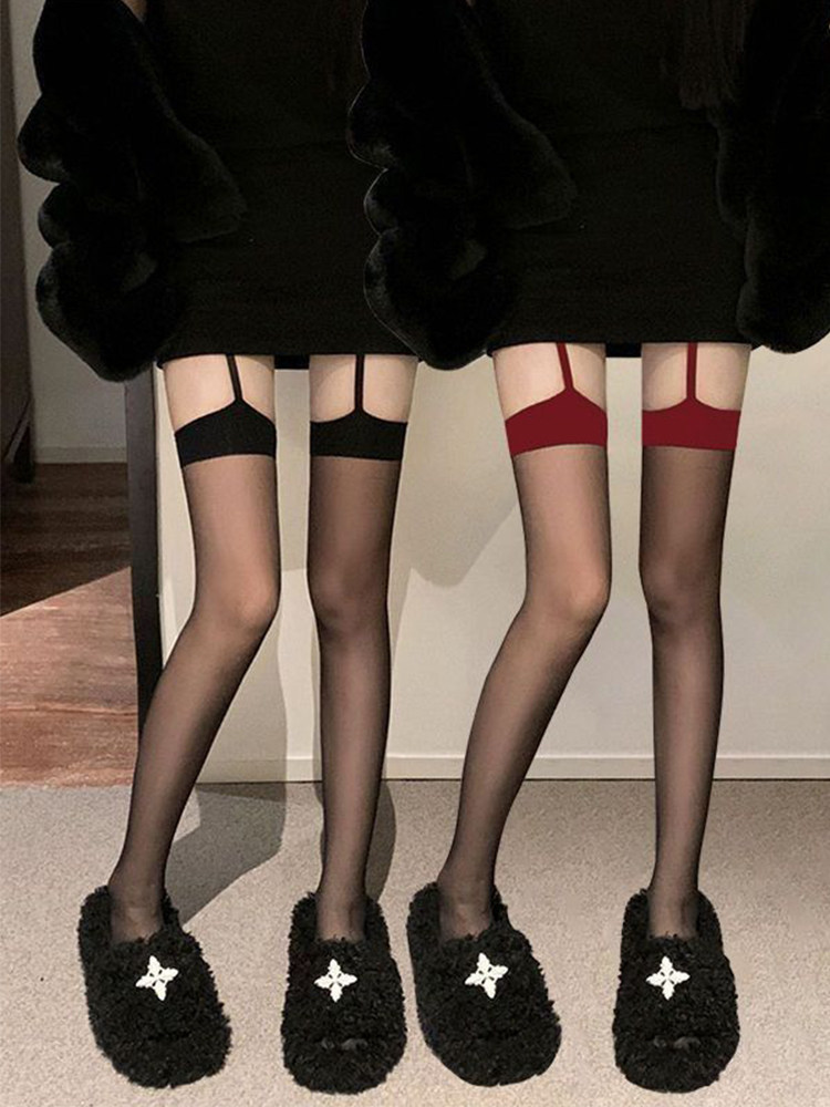 Sexy Suspender Black Stockings, Thin Red Trim Mid-Calf Socks, Lace Lolita Thigh-High Socks, Uniform Socks
