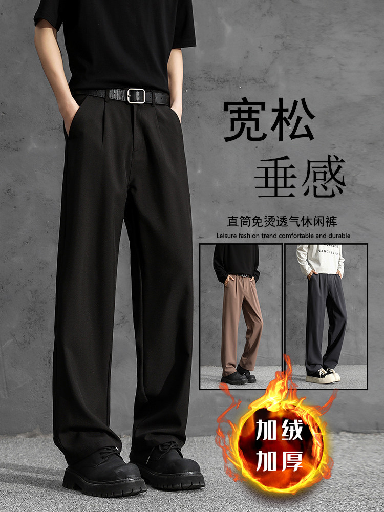 Black Straight-Leg Loose-Fitting Dress Pants for Men, with a Draping and High-End Feel, Winter Fleece-Lined Casual Pants, American-Style High-Waisted Suit Pants